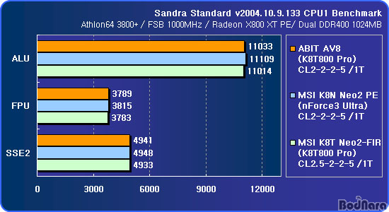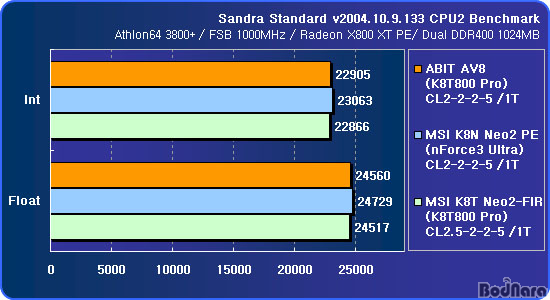 K8T800 Pro¸¦ »ç¿ëÇÑ AV8°ú K8T Neo2ÀÇ 95%¿¡ ºñÇØ ¿ì¼öÇÏ¿´´Ù. CL2.5·Î µ¿ÀÛÇÏ´Â K8T Neo2°¡ °¡Àå ³·Àº