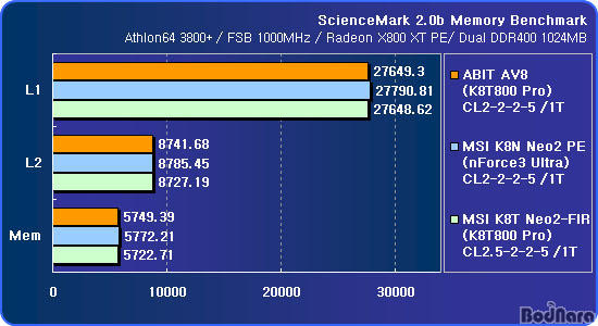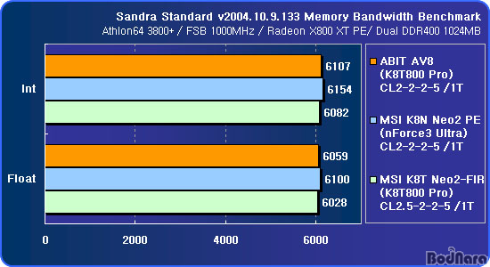 ¸Þ¸ð¸® ¼º´É º¥Ä¡¸¶Å© °á°ú´Â nVIDIAÀÇ nForce3 Ultra¸¦ »ç¿ëÇÑ K8N Neo2 ¸ÞÀκ¸µå°¡ VIA K8T800 Pro¸¦
