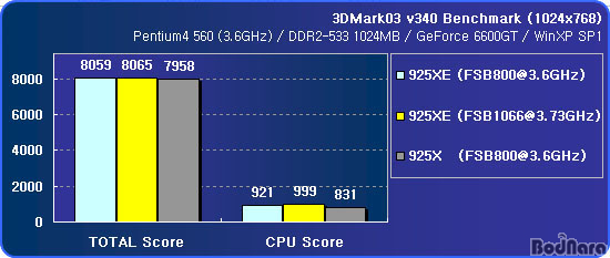 925XE - 925XE - 925X ¼øÀ¸·Î ³ªÅ¸³ª¸ç, CPU Å×½ºÆ® Ç׸ñÀÇ Á¡¼ö´Â 3DMark03 ¶§¿Í °°ÀÌ 925X°¡ °¡Àå ³·°Ô