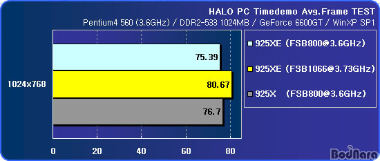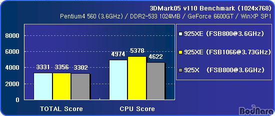 3DMark03/05¿Í µ¿ÀÏÇÏ°Ô 925XE°¡ 925X¿¡ ºñÇØ ¹Ì¼¼ÇÑ ¿ì¼¼¸¦, FSB1066¿¡ ¾à°£ Ŭ·°ÀÌ ¿À¹öµÈ ÆæÆ¼¾ö4