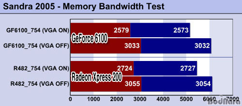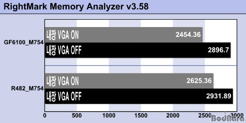 RightMark Memory Analyzer¿¡¼­µµ ½Ì±Ûä³Î ¸Þ¸ð¸® ±¸¼ºÀÇ Sempron 3100+ ½Ã½ºÅÛÀÇ GeForce 6100Àº Radeon Xpress 200º¸´Ù ¶³¾îÁö´Â °á°ú¸¦ º¸¿´´Ù. ´Ù¸¸ ³»Àå ±×·¡ÇÈÀ» »ç¿ëÇÏÁö ¾ÊÀ» °æ¿ì Radeon Xpress 200°ú ºñ½ÁÇÑ ´ë¿ªÆøÀ» º¸¿©ÁÖ°í ÀÖ´Ù.