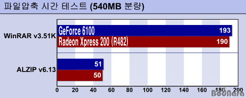 ÆÄÀÏ ¾ÐÃà¿¡ °É¸®´Â ½Ã°£µµ Radeon Xpress 200ÂÊÀÌ Çâ»óµÈ ¸Þ¸ð¸® ´ë¿ªÆøÀ» ±Ù°Å·Î GeForce 6100º¸´Ù ³ôÀº °á°ú¸¦ º¸¿´´Ù.