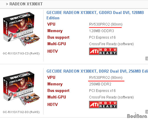 Radeon X1650 Pro¿Í X1300 XT¿¡ Àû¿ëµÇ´Â RV535¶ó´Â ÄÚ¾î À̸§Àº Áö±Ý ³ª¿Â 90nm Ĩ¼ÂÀÌ ¾Æ´Ï¶ó 80nm °øÁ¤À¸·Î ³ª¿À°Ô µÉ Ĩ¼Â¿¡ ºÙ¿©Áú À̸§À̹ǷΠ¿À´Ã »ìÆìº» Á¦Ç°µéÀº RV535°¡ ¾Æ´Ï¶ó RV530 Refresh Á¤µµ·Î º¸´Â °ÍÀÌ ¸ÂÀ» °ÍÀÌ´Ù. (½ÇÁ¦·Î GeCube ȨÆäÀÌÁö¿¡¼´Â Radeon X1300 XTÀ» RV530PRO2(90nm)¶ó°í Ç¥±âÇϰí ÀÖ´Ù)
