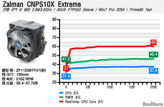Zalman CNPS10X ExtremeÀº idle »óÅ¿¡¼ CPU ¿Âµµ 31.4µµ(RealTemp 37µµ), Ç®·Îµå½Ã 37.6µµ(RealTemp 60µµ)¸¦ ±â·ÏÇØ Ç®·Îµå ¿Âµµ Å×½ºÆ® °á°ú °¡Àå ³·Àº CPU ¿Âµµ¸¦ ³ªÅ¸³Â´Ù. Å×½ºÆ® Á¦Ç° °¡¿îµ¥ CoolerMaster V10 ´ÙÀ½À¸·Î ¹«°Å¿î 920gÀÇ ¹«°Ô¿Í 8,544§²¿¡ ´ÞÇÏ´Â ¹æ¿ ¸éÀû, ÃÖ´ë 2162 RPMÀ¸·Î µ¿ÀÛÇÏ´Â Ä𸵠ÆÒÀÇ Á¶ÇÕÀ¸·Î ³ôÀº Ä𸵠¼º´ÉÀ» ¹ßÈÖÇÑ °ÍÀ¸·Î º¸ÀδÙ.