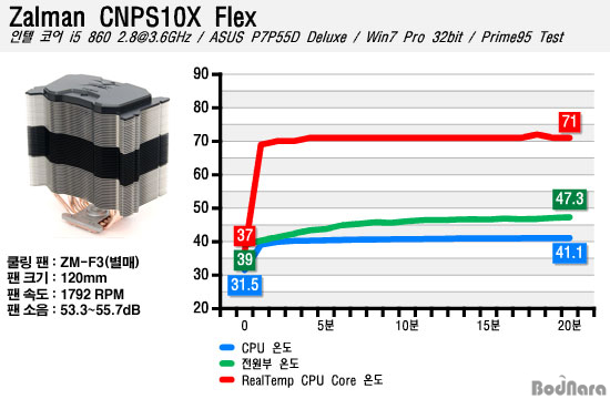 µà¾ó ÆÒ ÀåÂøÀÌ °¡´ÉÇϰí ÄÉÀ̽º ȣȯ¼ºÀ» À§ÇØ Äð·¯ ³ôÀ̸¦ ³·Ãá Zalman CNPS10X FlexÀÇ °æ¿ì À߸¸¿¡¼ º°µµ·Î ÆÇ¸ÅÇÏ´Â ZM-F3 120mm ÆÒÀ» »ç¿ëÇØ ¼º´ÉÀ» ÃøÁ¤ÇÑ °á°ú idle »óÅ¿¡¼ CPU 31.5µµ, RealTemp ÄÚ¾î 37µµ, Àü¿øºÎ 39µµÀÇ ¿Âµµ¸¦ ³ªÅ¸³Â´Ù.