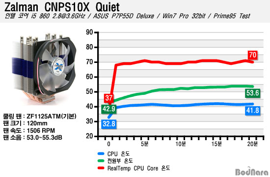 Zalman CNPS10X Quiet´Â Extreme ¸ðµ¨¿¡¼ ´Ü¼øÈ÷ 120mm ÆÒ¸¸ Àú¼ÒÀ½À¸·Î ¹Ù²Û °Ô ¾Æ´Ï¶ó ¹æ¿ÇÉ ¼ýÀÚ µî ¹æ¿¸éÀû ÀÚü°¡ ³·¾ÆÁø ¶óÀÌÆ® ¹öÀüÀ̱⠶§¹®¿¡ Ä𸵠¼º´ÉÀº 10X Extremeº¸´Ù ¶³¾îÁ³´Ù. idle »óÅ¿¡¼´Â CPU ¿Âµµ 32.8µµ(RealTemp 37µµ)·Î Å« Â÷À̰¡ ¾øÁö¸¸ Ä𸵠´É·Â Â÷À̸¦ ¾Ë ¼ö ÀÖ´Â Ç®·Îµå »óÅ¿¡¼´Â 41.8µµ·Î CPU ¿Âµµ°¡ Áõ°¡ÇØ ´Ù¸¥ Ÿ¿öÇü Ä𷯵é°ú ºñ½ÁÇϰųª ¾à°£ ¶³¾îÁö´Â ¸ð½ÀÀ» º¸¿´´Ù.