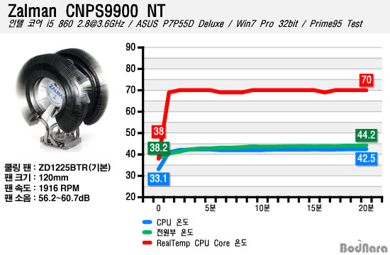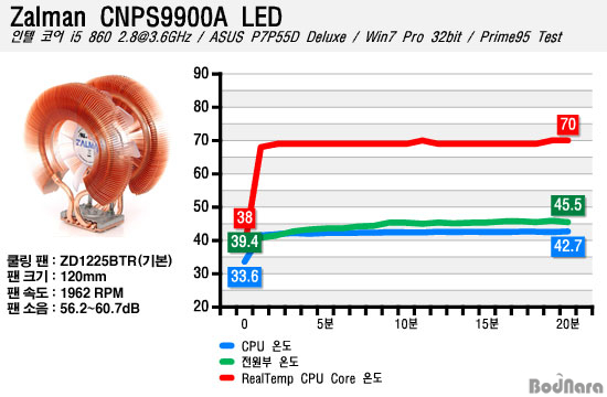 Zalman CNPS9900A LED´Â idle »óÅÂÀÇ ¿Âµµ ÃøÁ¤ °æ°ú CPU ¿Âµµ ¼¾¼´Â 33.6µµ, Àü¿øºÎ´Â 39.4µµ, RealTemp ÄÚ¾î ¿Âµµ 38µµ¸¦ ±â·ÏÇßÀ¸¸ç, Ç®·Îµå 20ºÐ °æ°ú ÈÄ ¿Âµµ´Â CPU 42.7µµ, RealTemp ÄÚ¾î 70µµ, Àü¿øºÎ 45.5µµ·Î CPU ¿Âµµ´Â Ÿ¿öÇü Ä𷯺¸´Ù ¶³¾îÁö´Â ´ë½Å Ä𷯸¦ Áö³ª°¡´Â ¹Ù¶÷ÀÌ Àü¿øºÎ È÷Æ®½ÌÅ©¿¡ ´õ Àß ´êÀ» ¼ö ÀÖ´Â ±¸Á¶¶ó¼ Àü¿øºÎ Ä𸵠¼º´ÉÀº Ÿ¿öÇü Ä𷯵麸´Ù ÁÁ°Ô ÃøÁ¤µÇ¾ú´Ù.