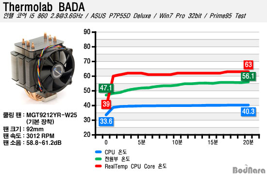 Thermolab BADA´Â 92mm ÆÒÀ» »ç¿ëÇÏ´Â ºñ±³Àû ÀÛÀº Å©±âÀÇ Á¦Ç°ÀÌÁö¸¸ ÃÖ´ë 3000 RPMÀ¸·Î µ¿ÀÛÇÏ´Â ÆÒ ¼Óµµ¸¦ ¹ÙÅÁÀ¸·Î idle »óÅ¿¡¼ 33.6µµ, Ç®·Îµå »óÅ¿¡¼ 40.3µµ·Î 120mm ÆÒÀ» ¾²´Â Ÿ¿öÇü Ä𷯵é°ú ºñ±³Çصµ ¶³¾îÁöÁö ¾Ê´Â ¼º´ÉÀ» º¸¿´´Ù. ´Ù¸¸ È®½ÇÇÑ CPU Ä𸵠ȿ°ú¸¦ º¸¿©ÁÖ´Â ¹ÐÁýµÈ È÷Æ®½ÌÅ© ±¸Á¶·Î Àü¿øºÎ È÷Æ®½ÌÅ©¿¡ ¹Ù¶÷ÀÌ ¸¹ÀÌ °¡Áö ¾Ê¾Æ¼ÀÎÁö Àü¿øºÎ ¿Âµµ´Â ºñ±³Àû ³ôÀº 56.1µµ±îÁö ¿Ã¶ó°¬´Ù.