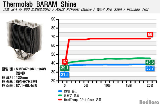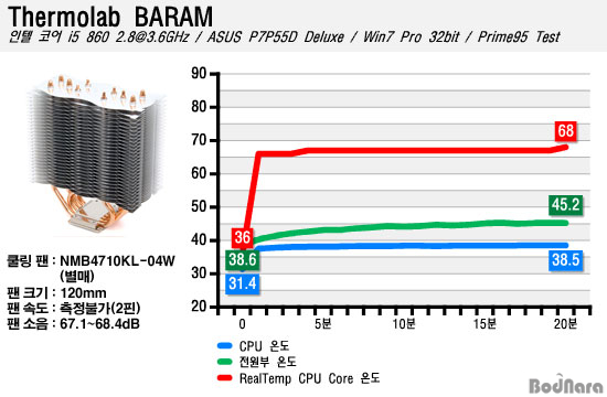 Thermolab BARAMÀº È÷Æ®½ÌÅ©·Î¸¸ ÆÇ¸ÅµÇ´Â Á¦Ç°À̶ó 120mm Ä𸵠ÆÒÀº º°µµ·Î ±¸ÀÔÇØ¼ ´Þ¾Æ¾ß ÇÑ´Ù. Thermolab¿¡¼ Á¦°øÇÑ NMB 4710KL-04W-B50 ÆÒÀº 2ÇÉ ÄÉÀ̺íÀ» »ç¿ëÇϰí ÀÖ¾î ÆÒ ¼Óµµ°¡ ÃøÁ¤µÇÁö ¾Ê¾ÒÀ¸³ª ½ºÆå»ó 2800 RPMÀ¸·Î µ¹¾Æ°¡¸é¼ Ä𸵠¼º´ÉÀ» ²ø¾î¿Ã·È´Ù. idle »óÅ¿¡¼ CPU ¿Âµµ 31.4µµ(RealTemp 36µµ), Àü¿øºÎ ¿Âµµ 38.6µµ¸¦ ±â·ÏÇß°í, Ç®·Îµå½Ã CPU ¿Âµµ´Â 38.5µµ(RealTemp 68µµ), Àü¿øºÎ 45.2µµ·Î ´Ù¸¥ Ä𷯵鿡 ºñÇØ ³ôÀº ¼º´ÉÀ» ±â·ÏÇß´Ù.