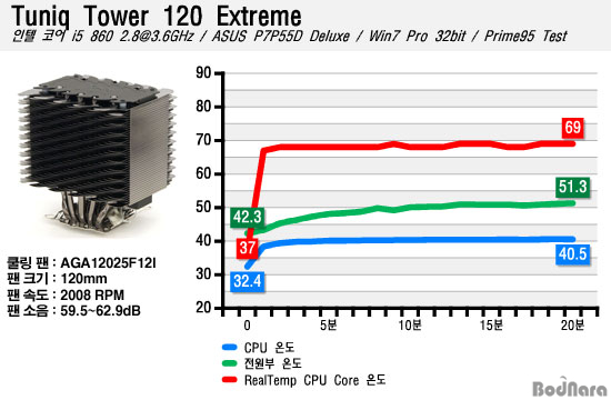 Tuniq Tower 120 ExtremeÀÇ idle »óÅ CPU ¿Âµµ´Â 32.4µµ(RealTemp 37µµ), Ç®·Îµå½Ã ¿Âµµ´Â 40.5µµ(RealTemp 69µµ)·Î ¾çÈ£ÇÑ ¼º´ÉÀ» º¸¿´´Ù. Àü¿øºÎ ¿Âµµµµ Ç®·Îµå »óÅ¿¡¼ 51.3µµ¸¦ ±â·ÏÇØ ÀÏ¹Ý Å¸¿öÇü Ä𷯵éÀÇ ¼º´É°ú ºñ±³ÇÒ ¶§ ¾çÈ£ÇÑ ¼öÁØÀÌ´Ù. ÀåÂøµÈ 120mm Ä𸵠ÆÒÀº ÃÖ´ë 2008 RPMÀÇ ¼Óµµ¸¦ ±â·ÏÇߴµ¥, ÆÒ ¼ÒÀ½Àº 59.5~62.9dB·Î 2000 RPM´ë ´Ù¸¥ 120mm Ä𷯵é°ú ºñ±³ÇØ ³ôÀº ÆíÀ̾ú´Ù. È÷Æ®½ÌÅ© »çÀÌ·Î ÀåÂøµÇ´Â ÆÒÀÇ Æ¯¼º»ó ¼ÒÀ½ÀÌ Á»´õ Ä¿Áø °ÍÀ¸·Î ÃßÃøµÈ´Ù.