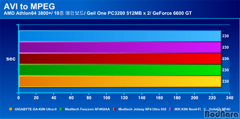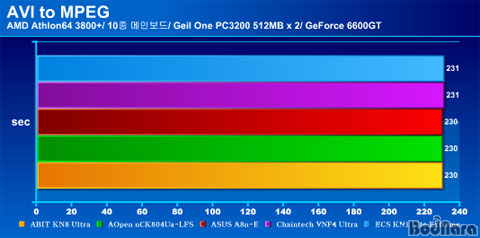 7.82GBÀÇ AVI ÆÄÀÏÀ» 37.6MBÀÇ MPEG ÆÄÀÏ·Î º¯È¯ÇÏ¿© º¸¾Ò´Ù. Chaintech°ú ECSÀÇ Á¦Ç°À» Á¦¿ÜÇÏ°í ¸ðµÎ 3ºÐ 50ÃÊ °¡·®ÀÇ ½Ã°£¿¡ ÆÄÀÏ º¯È¯À» ³¡¸¶ÃÆ´Ù.