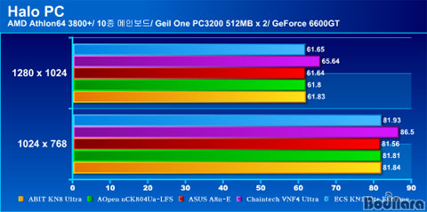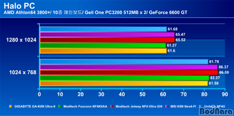 Halo PCÆÇÀÇ Å×½ºÆ®´Â Pixel Shader 2.0 ¿É¼ÇÀ» ¼³Á¤ÇÑ ÈÄ Å×½ºÆ®¸¦ ÁøÇàÇÏ¿´°í 2¹øÀ» ¹Ýº¹ÇÏ¿© Æò±ÕÀ» ³½ °á°úÀÌ´Ù. Chaintech, Meditech Jetway NF4 Ultra 939, MSIÀÇ Á¦Ç°ÀÌ ´Ù¸¥ Á¦Ç°µé°ú ºñ±³ÇÏ¿© ºñ½ÁÇÑ ¼öÁØÀ¸·Î °¡Àå ÁÁÀº ¼º´ÉÀÌ ÃøÁ¤µÇ¾ú´Ù.