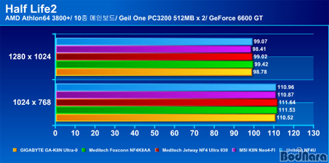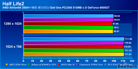 Half Life2ÀÇ °á°ú´Â ¸î¸î Á¦Ç°µéÀÌ ¾à°£ÀÇ ¾Õ¼­´Â ¼º´ÉÀ» º¸¿©Áִµ¥ ¸¹Àº Â÷À̸¦ º¸ÀÌÁö ¾ÊÀ¸¹Ç·Î ¿ÀÂ÷¹üÀ§ ³»¿¡ Æ÷ÇÔµÈ´Ù°í º¼ ¼ö ÀÖ´Ù. ECS°¡ °¡Àå ÁÁÀº ¼º´ÉÀÌ ÃøÁ¤µÇ¾ú°í ´ÙÀ½À¸·Î Meditech Jetway, Meditech Foxconn µîÀÇ ¼øÀÌ´Ù.