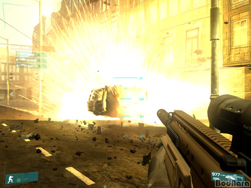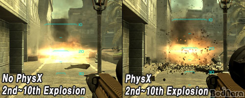 PCI ÀÎÅÍÆäÀ̽º¸¦ »ç¿ëÇÏ´Â AGEIA PhysX¿Í °°Àº ¹°¸® ¿¬»ê Ä«µå´Â ÇÁ·¹ÀÓ »ó½Â È¿°úº¸´Ù´Â Æø¹ß Àå¸éó·³ ¹°¸® ¿¬»êÀÌ Ãß°¡µÇ´Â ºÎºÐ¿¡¼­ ÈξÀ ¸ÚÁø È­¸éÀ» º¼ ¼ö ÀÖ´Ù. ÇÏÁö¸¸ Æø¹ßÀÌ ³­¹«ÇÏ°í ¿©·¯ ¸íÀÌÀÌ ±³ÀüÇÏ´Â "¹°¸® ¿¬»ê Ä«µå¿¡ ³ôÀº ºÎÇϰ¡ °É¸®´Â" Àå¸é¿¡¼­´Â °Å²Ù·Î ÇÁ·¹ÀÓÀÌ ÀúÇ쵃 °¡´É¼ºÀÌ ¸¹´Ù.