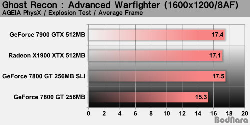 ¶§¹®¿¡ ÀÎÆ®·Î¿Í ´Þ¸®±â Å×½ºÆ®¿¡¼­´Â °¢±â ´Ù¸¥ °á°ú¸¦ º¸¿´´ø Radeon X1900 XTX³ª GeForce 7900 GTX 512MB, GeForce 7800 GT SLI ½Ã½ºÅÛµµ ¹°¸® ¿¬»ê Ä«µå¸¦ ´Þ°í Æø¹ß Å×½ºÆ®¸¦ ÇÏ°Ô µÇ¸é ¸ðµÎ 17 ÇÁ·¹ÀÓ ¾ÈÆÆÀ¸·Î ¶³¾îÁø´Ù. Áï, À̹ø °ÔÀÓ º¥Ä¡¿¡ »ç¿ëµÈ Å×½ºÆ® ½Ã½ºÅÛ + ¹°¸® ¿¬»ê Ä«µå°¡ Æø¹ß Å×½ºÆ®¿¡¼­ ±×·¡ÇÈ Ä«µå¿¡ º¸³¾ ¼ö ÀÖ´Â µ¥ÀÌÅÍÀÇ ÇѰ谡 Æò±Õ 17 ÇÁ·¹ÀÓ¿¡ ºÒ°úÇÏ´Ù´Â ¶æÀÌ´Ù.