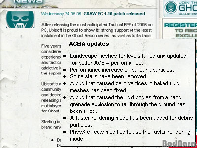 °í½ºÆ® ¸®ÄÜ : ¾îµå¹ê½ºµå ¿öÆÄÀÌÅ͸¦ ¸¸µç UBI Soft ȨÆäÀÌÁö¿¡´Â 5¿ù 24ÀÏÀÚ·Î »õ·Î¿î 1.10 ÆÐÄ¡°¡ ¿Ã¶ó¿Ô´Âµ¥, ÀÌ ÆÐÄ¡´Â ±âÁ¸¿¡ ¾Ë·ÁÁø ¿©·¯ ¹ö±× ¼öÁ¤°ú ÇÔ²² ¹°¸® ¿¬»ê Ä«µåÀÎ AGEIA PhysX¸¦ ÀåÂøÇßÀ» ¶§ ¼º´ÉÀÌ ¿Ã¶ó°¡µµ·Ï Çß´Ù°í ÇÑ´Ù.