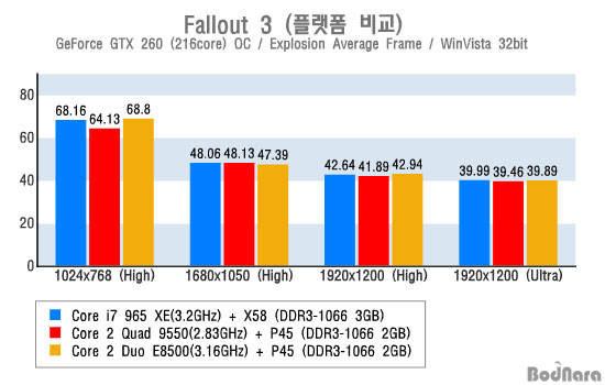 °°Àº ±×·¡ÇÈ Ä«µå¿¡¼ Æú¾Æ¿ô3ÀÇ Ç÷§Æûº° ¼º´É ºñ±³·Î ÁöÆ÷½º GTX 260 OC ¸ðµ¨À» ÄÚ¾î i7 965 XE, ÄÚ¾î 2 Äõµå Q9550, ÄÚ¾î 2 µà¿À E8500 ½Ã½ºÅÛ¿¡ Å×½ºÆ®ÇÑ °á°ú CPU¿¡ ¿µÇâÀ» ¸¹ÀÌ ¹Þ´Â ÀúÇØ»óµµ¸¦ Á¦¿ÜÇÑ 1680x1050 ÀÌ»ó °íÇØ»óµµ¿Í °íǰÁú µðÅ×ÀÏ ¿É¼ÇÀ¸·Î´Â Ç÷§Æûº° ¼º´É Â÷À̸¦ °ÅÀÇ ´À³¥ ¼ö ¾ø¾ú´Ù.