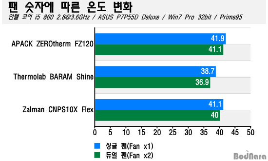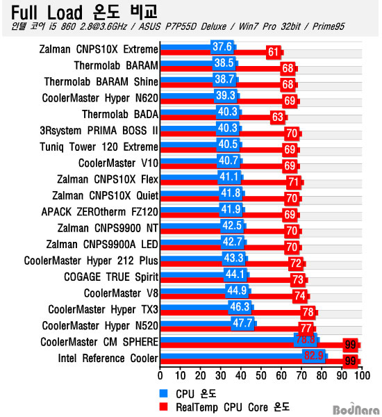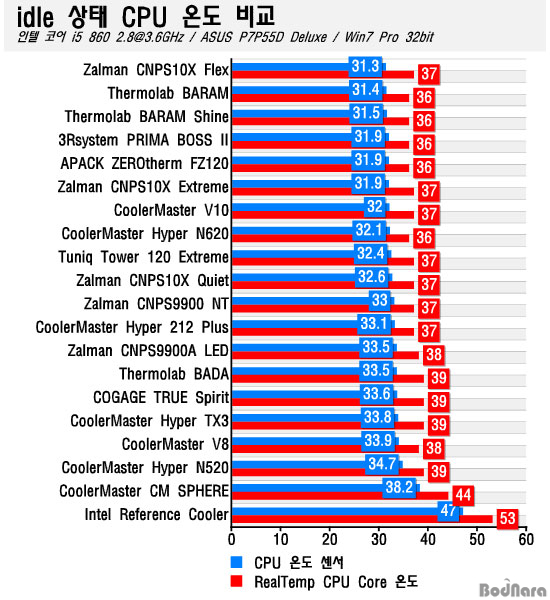 Å×½ºÆ®¿¡ »ç¿ëµÈ 20°³ÀÇ LGA1156 Áö¿ø Ä𷯵éÀÇ idle »óÅÂÀÇ CPU ¿Âµµ ÃøÁ¤ °á°ú¸¦ ºñ±³Çغ¸¸é, Zalman CNPS10X Flex°¡ °¡Àå ³·Àº ¿Âµµ¸¦ ³ªÅ¸³ÂÁö¸¸ RealTemp ÃøÁ¤ °á°ú¿¡¼­´Â 1µµ °¡·® ´õ ³ôÀº Æò±Õ 37µµÀÇ ÄÚ¾î ¿Âµµ¸¦ º¸¿´´Ù. ±× µÚ¸¦ 2800 RPM ÆÒÀ» »ç¿ëÇÑ Thermolab BARAM ½Ã¸®Áî°¡ À̾ú°í 3Rsystem, APACK, Zalman Á¦Ç°µéÀÌ ¼±µÎ±×·ìÀ» Çü¼ºÇß´Ù.