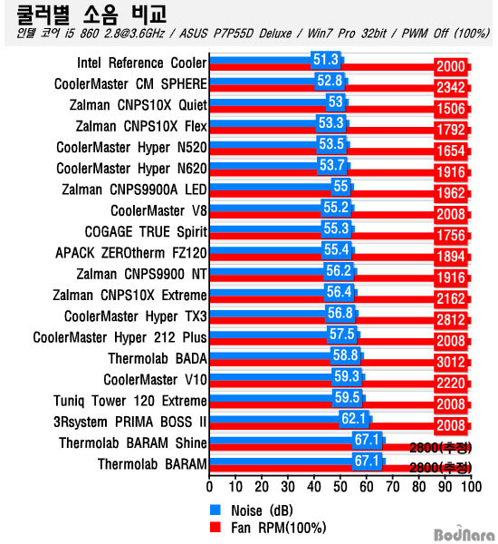 ¼ÒÀ½ ÃøÁ¤±â¸¦ »ç¿ëÇØ °¢ Ä𷯺° ¼ÒÀ½À» ÃøÁ¤Çغ» °á°ú ÀÎÅÚ Á¤Ç° Äð·¯°¡ °¡Àå ³·Àº ¼ÒÀ½À» ±â·ÏÇßÀ¸¸ç, 66mm·Î °¡Àå ÀÛÀº ÆÒÀ» °¡Áø CoolerMaster CM Sphere°¡ 2¹øÂ°·Î Á¶¿ëÇß°í À߸¸ÀÇ CNPS10X Quiet¿Í ZM-F3 ÆÒÀ» ÀåÂøÇÑ 10X Flex, CoolerMaster Hyper N520/N620ÀÌ ±× µÚ¸¦ À̾ú´Ù.