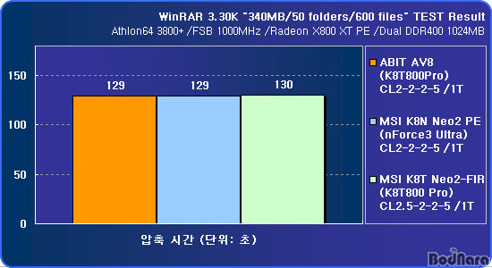 Neo2°¡ µ¿ÀÏÇÑ 129ÃÊ(2ºÐ9ÃÊ)¸¸¿¡ ¾ÐÃàÀ» ³¡³Â°í, MSI K8T Neo2´Â À̺¸´Ù 1Ãʰ¡ ´ÊÀº 130ÃÊ(2ºÐ10ÃÊ)°¡ °É·È´Ù.