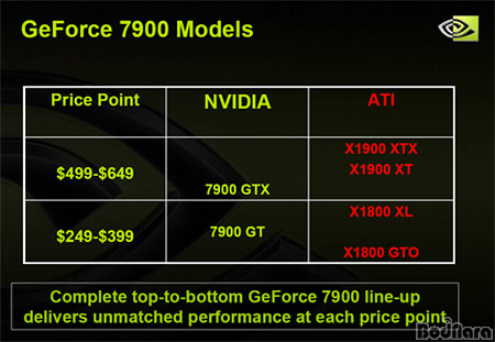 nVIDIAÀÇ ÀÌ·¯ÇÑ Àǵµ´Â GeForce 7900 GTXÀÇ °¡°ÝÀ» º¸¸é ½±°Ô ¾Ë¼ö°¡ ÀÖ´Ù. nVIDIA´Â À̹ø GeFoce 7900 GTXÀÇ °¡°ÝÀ» 499´Þ·¯¿¡ ¹ßÇ¥ÇÏ¿© ±âÁ¸ GeForce 7800 GTX 512MBÀÇ °¡°ÝÀÎ 649´Þ·¯º¸´Ù Àú·ÅÇÑ °¡°Ý¿¡ ´õ ³ôÀº ¼º´ÉÀ» Á¦°øÇÏ°Ô ¸¸µé¾ú´Ù. ÀÌ °¡°ÝÀº °æÀï»çÀÇ µ¿±Þ Á¦Ç°º¸´Ù »ó´çÈ÷ Àú·ÅÇÑ °¡°ÝÀε¥ ÀÌ °¡°ÝÁ¤Ã¥ÀÌ ±×´ë·Î ¹Ý¿µµÈ´Ù¸é ÃÖ°í ÀÚ¸®´Â µÇãÁö ¸øÇÏ´õ¶óµµ ÇÏÀÌ¿£µå ±×·¡ÇÈÄ«µå ½ÃÀå¿¡¼­ÀÇ Á¡À¯À²Àº ´õ ³ô¾ÆÁú¼ö ÀÖÀ» °ÍÀÌ´Ù.