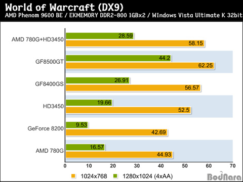 Áö±Ý±îÁöÀÇ °á°ú¿Í´Â ´Ù¸£°Ô AMD 780G ¹× HD 3450ÀÇ ¼º´ÉÀÌ ºñ±³ Á¦Ç°µé¿¡ ºñÇØ ³ôÁö ¾ÊÀº ¸ð½ÀÀ» º¸¿©ÁÖ°í ÀÖ´Ù. ¿ø·¡ WOW°¡ NVIDIA ±×·¡ÇÈ Ä«µå¿¡ ÃÖÀûÈ­µÈ ¸¸Å­ ATI ±×·¡ÇÈÄ«µå¿¡¼­´Â »ó´ëÀûÀ¸·Î ³·Àº ¼º´ÉÀ» º¸¿©ÁÖ°í Àִµ¥, °á±¹ ÇÏÀ̺긮µå Å©·Î½ºÆÄÀ̾ ±¸¼ºÇÑ »óÅ¿¡¼­µµ GeForce 8400GS Á¤µµÀÇ ¼º´É¸¸À» º¸¿©ÁÖ°í ÀÖ´Ù. ƯÈ÷ ÇØ»óµµ¸¦ ³ôÈ÷°í ¸ÖƼ »ùÇøµÀ» 4xAA·Î ¼³Á¤ÇÑ °æ¿ì¿¡´Â AMD 780G + HD3450Á¶ÇÕÀº GeForce 8500GTÀÇ ¾à 65% Á¤µµÀÇ ¼º´É¹Û¿¡ ³»Áú ¸øÇϰí ÀÖ´Ù.