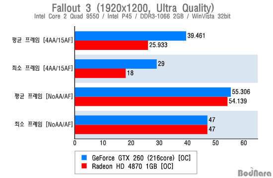 ATI ¶óµ¥¿Â °è¿ÀÇ ÇÁ·¹ÀÓ ÀúÇÏ ¿øÀÎÀ» »ìÆìº¸±â À§ÇØ ¶È°°Àº 1920x1200 ÇØ»óµµ¿¡¼ µðÅ×ÀÏ ¼³Á¤À» Ultra ¿É¼Ç¿¡ ¸ÂÃß°í AA/AF ¿É¼Ç¸¸ NoAA, NoAF·Î ¹Ù²ï µÚ¿¡ Å×½ºÆ®¸¦ Çß´Ù. ±× °á°ú AA, AF¸¦ ¼³Á¤ÇÑ Å×½ºÆ®¿¡¼´Â ÁöÆ÷½º GTX 260 OC¿Í ¶óµ¥¿Â HD 4870 1GB OC ¸ðµ¨ÀÇ Æò±Õ ¹× ÃÖÀú ÇÁ·¹ÀÓ Â÷À̰¡ »ó´çÇßÁö¸¸, NoAA/NoAF Å×½ºÆ®¿¡¼´Â ±×·¡ÇÈ Ä«µå °£ÀÇ ¼º´É Â÷À̰¡ °ÅÀÇ ¾ø¾úÀ¸¸ç ÃÖÀú ÇÁ·¹ÀÓÀº µÎ Á¦Ç° ¸ðµÎ 47 ÇÁ·¹ÀÓÀ¸·Î ¿Ã¶ó°¬´Ù.
