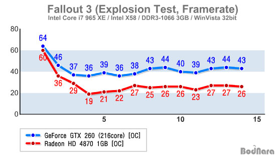 ¹Ý¸é, Æø¹ß Å×½ºÆ®¿¡¼ÀÇ Æò±Õ ÇÁ·¹ÀÓ º¯È¸¦ »ìÆìº¸¸é Æø¹ßÀÌ ½ÃÀ۵DZâ Àü ÃÖÃÊ ÇÁ·¹ÀÓÀº µÎ Á¦Ç°ÀÇ Â÷À̰¡ Å©Áö ¾Ê´Ù°¡ Æø¹ß Å×½ºÆ®¸¦ ½ÃÀÛÇÑ ÈÄ Æò±Õ ÇÁ·¹ÀÓÀÌ ¾à 10~15 ÇÁ·¹ÀÓ Á¤µµ °è¼Ó ¹ß»ýÇÏ´Â °ÍÀ» º¼ ¼ö ÀÖ´Ù. ÀÌ·± ±×·¡ÇÁ ¸ð¾çÀº Å×½ºÆ®°¡ ³¡³¯ ¶§±îÁö À̾îÁö´Âµ¥ À̰ÍÀº ¶óµ¥¿Â °è¿ÀÇ ÃÖÀú ÇÁ·¹ÀÓ(Minimum Frame)ÀÌ ÁöÆ÷½º¿¡ ºñÇØ ÈξÀ ³·±â ¶§¹®ÀÌ´Ù.