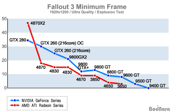 HD 4870X2¸¸ÀÌ ºñÁ¤»óÀûÀ¸·Î º¸ÀÏ Á¤µµ·Î ³ôÀº ÃÖÀú ÇÁ·¹ÀÓÀ» ±â·ÏÇϰí ÀÖÀ¸¸ç ³ª¸ÓÁö Á¦Ç°µéÀº ÁöÆ÷½º °è¿¿¡ ºñÇØ