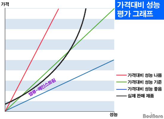 À¯ÀúµéÀÌ ¿øÇÏ´Â ÀÌ»óÀûÀÎ °¡°Ý´ëºñ ¼º´É ±×·¡ÇÁ´Â ÆÄ¶õ»ö Á÷¼±¿¡ ÇѾøÀÌ °¡±î¿î °ÍÀÌÁö¸¸, ½ÇÁ¦·Î ½ÃÀå¿¡ ÆÇ¸ÅµÇ´Â Á¦Ç°Àº ±âº» Á¦Á¶ ´Ü°¡¿Í ÇÏÀÌ¿£µå/Ç÷¡±×½Ê °è¿ÀÇ °í¸¶Áø µîÀ» ÀÌÀ¯·Î °ËÀº»ö ±×·¡ÇÁ¿Í ºñ½ÁÇÑ ¾ç»óÀ» ¶ç°í ÀÖ´Ù. µû¶ó¼ °¡°Ý´ëºñ ¼º´ÉÀ¸·Î À¯ÀúµéÀÇ °øÅëÀûÀΠȣÀÀÀ» ¾òÀ» ¼ö ÀÖ´Â ºÎºÐÀº ´ë°³ °ËÀº»ö ±×·¡ÇÁ°¡ ÃÊ·Ï»ö ¶óÀÎ ¾ÈÂÊÀ¸·Î µé¾î¿À´Â ¹ë·ù-¸ÞÀνºÆ®¸² ¶óÀξ÷ÀÌ µÈ´Ù.