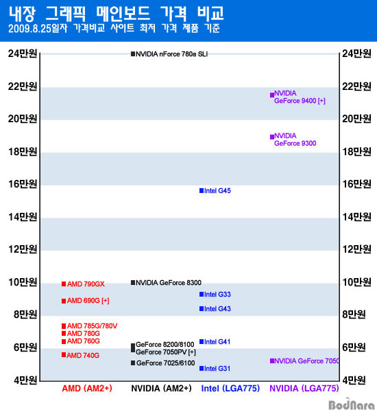 3 ȸ»çÀÇ ¸ÞÀκ¸µå Ĩ¼ÂµéÀ» ´Ù½Ã AMD¿Í ÀÎÅÚ Áø¿µÀ¸·Î ¾çºÐÇØ¼ »ìÆìº¸¸é µÎ ±×·¡ÇÈ Ä¨¼Â Á¦Á¶»ç°¡ Á÷Á¢ ¸ÂºÙ´Â AMD Ç÷§Æû¿¡¼´Â ³»Àå ±×·¡ÇÈÀÌ ¸ñÀûÀÌ ¾Æ´Ñ ¿£Æ÷½º 780a SLI¸¦ Á¦¿ÜÇÑ ³ª¸ÓÁö´Â ÀÏÁ¤ ±Ý¾× ¾È¿¡ ´ëºÎºÐÀÇ Á¦Ç°µéÀÌ ´Ù´Ú´Ù´Ú ºÙÀº ¸ð½ÀÀ» Çϰí ÀÖÁö¸¸, ÀÎÅÚ °è¿ ³»Àå ±×·¡ÇÈ Ä¨¼ÂµéÀº °¡°Ý Â÷À̰¡ ¸¹ÀÌ ³ª¸é¼ µë¼ºµë¼º ¹ú¾îÁø ¸ð½ÀÀ» ÇÑ´Ù.