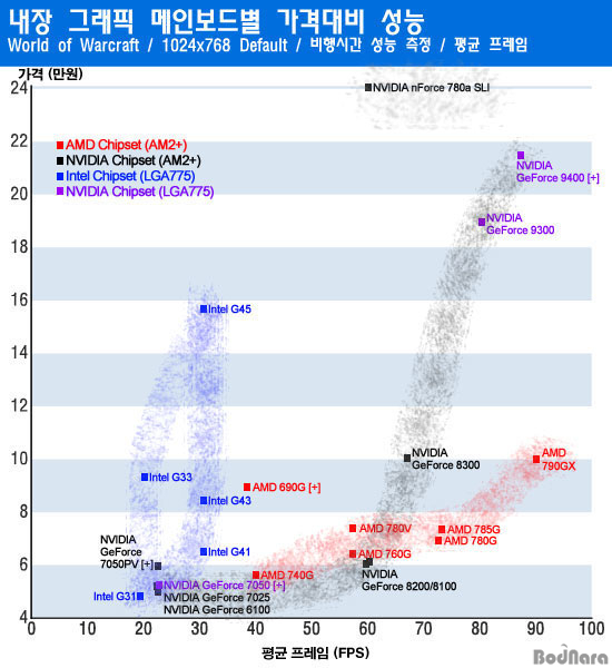 3DMark06¿¡ ÀÌ¾î ¿ùµå ¿Àºê ¿öÅ©·¡ÇÁÆ® °ÔÀÓÀÇ Æò±Õ ÇÁ·¹ÀÓÀ» ±âÁØÀ¸·Î ÀÛ¼ºÇÑ °¡°Ý´ëºñ ¼º´É ºñ±³ ±×·¡ÇÁµµ µ¿ÀÏÇÑ ÇüŸ¦ ¶ç°í ÀÖ´Ù. ¿ÀÈ÷·Á 3DMark06¿¡¼´Â SM3.0 Å×½ºÆ®°¡ ºüÁö¸é¼ Á¡¼ö°¡ ³·¾Ò´ø ±¸¼¼´ë ÀÎÅÚ G3x °è¿À̳ª AMD 740G/690G Á¦Ç°ÀÇ ¼º´É Â÷À̰¡ ÁÙ¾îµé¾ú´Ù.