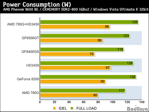 ´ë±â½ÃÀÇ ¼Òºñ Àü·ÂÀº ¿¹»ó¿Ü·Î GeForce 8400GS°¡ °¡Àå ³·Àº ¸ð½ÀÀ» º¸¿©ÁÖ¾úÀ¸¸ç ±× µÚ¸¦ AMD 780G¸¦ Â÷ÁöÇϰí ÀÖ´Ù. ƯÈ÷ ÁÖ¸ñÇÒ Á¡Àº HD 3450ÀÇ ´ë±â»óÅÂÀÇ ¼ÒºñÀü·ÂÀÌ ¿¹»óº¸´Ù Å« ÆíÀε¥, AMD 780G¿ÍÀÇ ÇÏÀ̺긮µå Å©·Î½ºÆÄÀÌ¾î ±¸¼ºÀÏ ¶§¿¡´Â ¿ÀÈ÷·Á ¼ÒºñÀü·ÂÀÌ ³·¾ÆÁö´Â ¸ð½ÀÀ» º¸¿©ÁÖ°í ÀÖ´Ù.