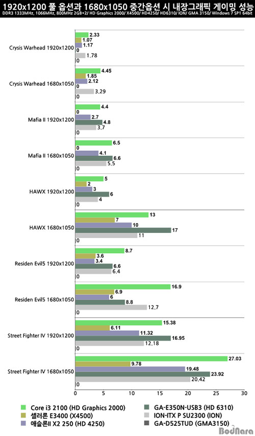 Street Fighter IVÀÇ °æ¿ì Ç® ¿É¼Ç¿¡¼­´Â ÄÚ¾î i3 2100 (HD Graphics 2000)°ú GA-E350N-USB3(HD 6310)°¡, Áß°£ ¿É¼Ç¿¡¼­´Â ¼¿·¯·Ð E3400(X4500) ½Ã½ºÅÛÀ» Á¦¿ÜÇÏ¸é ±×·±´ë·Î Ç÷¹À̰¡ °¡´ÉÇÑ ¼öÁØÀÌÁö¸¸ ÇÁ·¹ÀÓ ´ÜÀ§ÀÇ ¹Ì¼¼ Á¶ÀÛÀÌ ÇÊ¿äÇÑ ´ëÀü°ÝÅõ °ÔÀÓÀÓÀ» °¨¾ÈÇÏ¸é ¸¸Á·ÇÒ ¼öÁØÀº ¾Æ´Ò °ÍÀÌ´Ù.