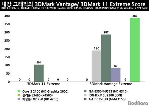 3DMark Vantage Extreme Å×½ºÆ®¿¡¼­´Â G41 ³»Àå ±×·¡ÇÈ ÄÚ¾îÀÎ X4500ÀÌ 4xAA¸¦ Áö¿øÇÏÁö ¾Ê¾Æ °á°ú°ªÀ» »êÃâÇÏÁö ¸øÇßÀ¸¸ç, ¾Ö½½·ÐII X2 250Àº °¡Àå ³·Àº 82Á¡À», °¡Àå ³ôÀº ½ºÄھ ±â·ÏÇÑ ÄÚ¾î i3 2100ÀÇ HD Graphics 2000Àº 387Á¡À¸·Î ¾à 4.72¹è ³ôÀº ½ºÄھ ±â·ÏÇß´Ù.