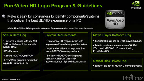 NVIDIA´Â PureVideo HD ±â¼úÀ» Áö¿øÇÏ´Â ¸ðµç ±×·¡ÇÈ Ä«µå¿¡ PureVideo HD ·Î°í¸¦ »ç¿ëÇÒ ¼ö ÀÖµµ·Ï Çϰí ÀÖ¾ú´Âµ¥ ÃÖ±Ù ±×·¡ÇÈ Ä«µå, PC µîÀÇ ÆÄÆ®º°·Î ±ÔÁ¤À» ¸¶·ÃÇÏ¿© PureVideo HD ·Î°í ÇÁ·Î±×·¥À» ½ÃÀÛÇß´Ù. ÀÌ´Â PureVideo HD ·Î°í´Â HDCP¸¦ Áö¿øÇÏ´Â Á¦Ç°µé¿¡¸¸ »ç¿ëÇϵµ·Ï Á¦¾ÈÇÑ °ÍÀ¸·Î ±âÁ¸¿¡´Â Á¦Á¶»ç¿¡ µû¶ó HDCP Áö¿ø À¯¹«¸¦ °áÁ¤ÇÒ ¼ö ÀÖ¾ú´ø »óȲÀ» °í·ÁÇÑ´Ù¸é ºÒ¸®ÇØÁø ºÎºÐÀÏ ¼öµµ ÀÖ´Ù. ÀÌ ¹æ½ÄÀÌ Àû¿ëµÇ¸é HDCP Áö¿ø À¯¹«¿¡ µû¸¥ È¥¶õÀ» ¸·À» ¼ö ÀÖ°ÚÁö¸¸, ±¹³»¸¸ º¸¾Æµµ À¯Åë»çµé¸¶´Ù °¢ÀÚ ºê·£µå¿Í ¹Ú½º µðÀÚÀÎÀ» »ç¿ëÇÏ´Â »óȲÀ̱⠶§¹®¿¡ ¾ó¸¶³ª È¿°ú¸¦ °ÅµÑÁö´Â Àǹ®ÀÌ´Ù.