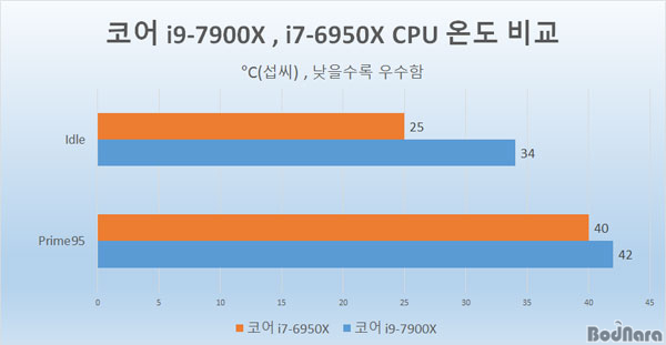 ÇÁ·Î¼¼¼´Â ¼ÒºñÀü·Â°ú ¿Âµµ°¡ ºñ·ÊÇÏ¿© »ó½ÂÇϹǷΠ¿Âµµ ¿ª½Ã ÄÚ¾î i9-7900X°¡ ´õ ³ô°Ô ÃøÁ¤µÇ¾ú´Ù.