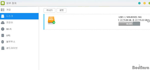 '¿ÜºÎ ÀåÄ¡'¿¡¼´Â USB Æ÷Æ®¿¡ ¿¬°áÇÑ ÀåÄ¡¸¦ È®ÀÎÇÏ°í °ü¸®ÇÒ ¼ö ÀÖ´Ù. ¿ÜÀåÇϵå¿Í USB ¸Þ¸ð¸®, ÇÁ¸°ÅÍ, ¿ÍÀÌÆÄÀÌ(Wi-Fi) ¸ðµâ,