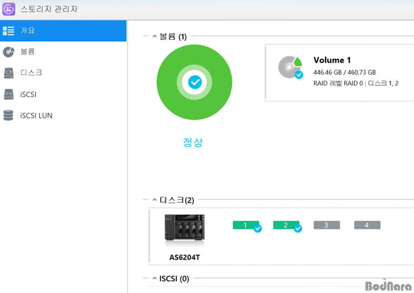 '½ºÅ丮Áö °ü¸®ÀÚ'¿¡¼´Â NAS ³»ºÎ¿¡ ÀåÂøµÈ HDD ¹× SSD ¿ë·®°ú »óŸ¦ È®ÀÎÇÒ ¼ö ÀÖ´Ù. ÀÌ¹Ì ÃʱâÈ ¼³Á¤¿¡¼ µå¶óÀÌºê º¼·ý ¼³Á¤À»