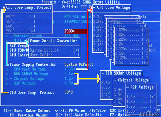 Á¶ÀýÇÒ ¼ö Àִµ¥, CPU´Â 1.85V±îÁö, ¸Þ¸ð¸®´Â 2.8V, AGP ½½·Ô¿¡´Â 1.7V±îÁö Àü¾ÐÀ» ¿Ã¸± ¼ö ÀÖ´Ù. ±×·±µ¥ CPUÀÇ ÃÖÀúÀü¾Ð