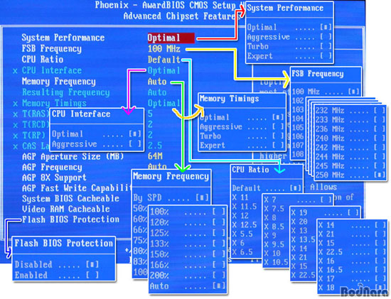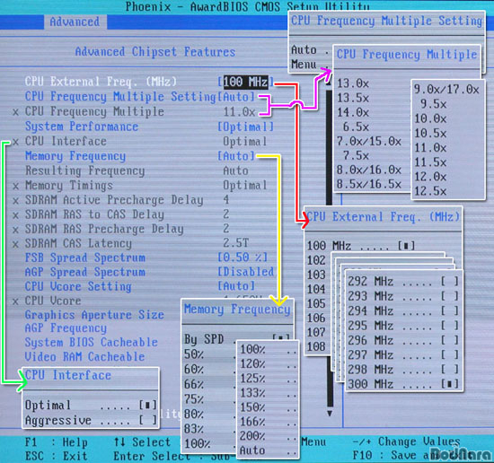 Advanced Chipset Features ¿¡¼ ÇØ´ç Ç׸ñµéÀ» ¼³Á¤Çϴµ¥, CPUÀÇ ¹è¼ö´Â ÃÖ´ë 22.5x ±îÁö ÀÖÀ¸¸ç