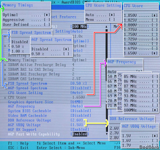 CPUÀÇ Àü¾ÐÀº ÃÖ´ë 2.3V±îÁö ÁÙ ¼ö ÀÖ°í ¸Þ¸ð¸®´Â 2.9V, AGP ½½·Ô¿¡´Â 1.8V, ±×¸®°í Ĩ¼Â¿¡´Â 1.7V±îÁö Àü¾ÐÀ» ¿Ã·ÁÁÙ ¼ö