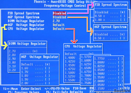 Frequency/Voltage Control¿¡¼ ¼³Á¤ÀÌ °¡´ÉÇѵ¥, CPU, ¸Þ¸ð¸®, AGP ¼¼°¡ÁöÀÇ Àü¾Ð Á¶ÀýÀÌ