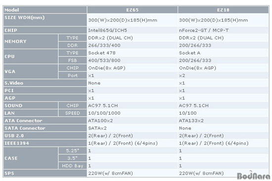 EZ65¿Í, AMD Áö¿øÀ¸·Î´Â nForce2 IGP º¸µå°¡ µé¾îÀÖ´Â EZ18ÀÇ µÎ Á¾·ù°¡ Àִµ¥ µÎ Á¦Ç°°£ÀÇ ½ºÆåÀÇ Â÷ÀÌ´Â ¾Æ·¡ÀÇ
