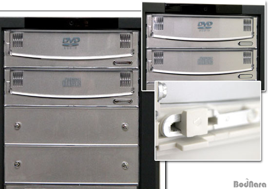 LED ¾Æ·¡·Î 4°³ÀÇ 5.25" º£À̰¡ º¸À̴µ¥, ÄÉÀ̽º »ö°ú ´Ù¸¥ ±¤µå¶óÀ̺ê Á¦Ç°À» »ç¿ëÇØµµ ÅëÀϼºÀ» À¯ÁöÇÒ ¼ö ÀÖµµ·Ï