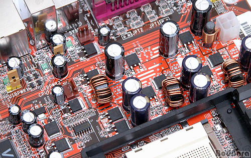 ¸ÞÀκ¸µåÀÇ ÇÙ½ÉÀÎ Àü¿øºÎ »çÁøÀÌ´Ù. À§ÀÇ »çÁøÀ» º¸¸é CPU¿¡ Àü·ÂÀ» °ø±ÞÇÏ´Â Àü¿øºÎÀÇ ±¸¼ºÀÌ Multi-Phase ¹æ½ÄÀÌ°í ±×Áß¿¡¼µµ 3 Phase ¹æ½ÄÀÓÀ» ¾Ë¼ö°¡ Àִµ¥ ÃÖ±ÙÀÇ ´Ù¸¥ Á¦Ç°µé¿¡ »ç¿ëµÈ 3 Phase Àü¿øºÎ ±¸¼ºÃ³·³ Phase ´ç 3°³ÀÇ MosfetÀ» »ç¿ëÇÏ¿© ÀϹÝÀûÀÎ 2°³ÀÇ Mosfet Á¦Ç°º¸´Ù ´õ ³ôÀº Ãâ·ÂÀ» Áö¿øÇÏ°Ô ¸¸µé¾îÁ® ÀÖ´Ù.