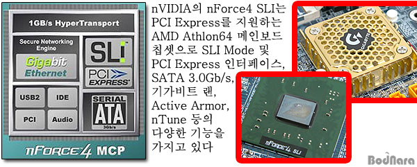 GA-K8NXP-SLI ¸ÞÀκ¸µå¿¡´Â nForce4 MCP¾È¿¡ ³»ÀåµÈ ¸ðµç ±â´ÉÀ» »ç¿ëÇÏ´Â nForce4 SLI Ĩ¼ÂÀÌ »ç¿ëµÇ¾úÀ¸¸ç Ȳ±Ý»öÀÇ Äð·¯°¡ ºÙ¾îÀÖ´Ù.