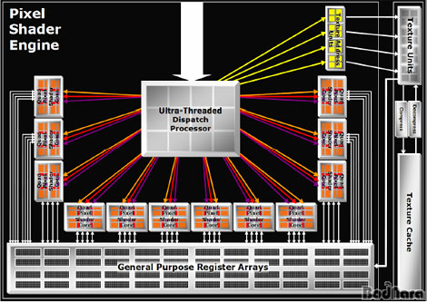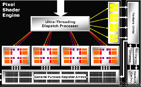 ±×¸®°í ÇѰ¡Áö´õ, À̰ÍÀº Ultra-Threaded Dispatch Processor¸¦ »ç¿ëÇÑ À̹ø R5xx GPUµéÀÇ Æ¯Â¡ ¶§¹®¿¡ ÇÊ¿äÇÑ GPRA(General Purpose Register Arrays) ºÎºÐµµ Pixel Shader À¯´ÖÀÌ Áõ°¡µÊ¿¡ µû¶ó ±×¿¡ ¸Â°Ô Áõ°¡µÇ¾ú´Ù.(»çÁø»ó ÇϴܺÎÀÇ È¸»ö ºÎºÐ)
