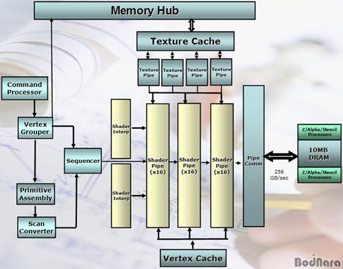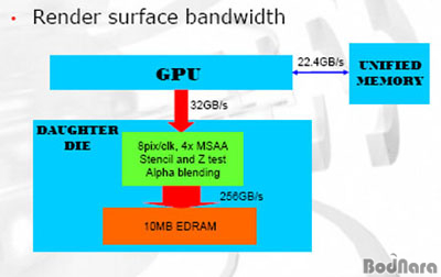 ATI GPU ¿·¿¡ ºÙÀº ÀÛÀº Daughter ´ÙÀÌ´Â 10MB ÀÓº£µðµå DRAM¸¸ ´Þ¶û ºÙÀº °ÍÀÌ ¾Æ´Ï¶ó ÀÓº£µðµå DRAMÀ» »ç¿ëÇÏ´Â Çȼ¿ ÇÁ·Î¼¼¼­ ºÎºÐÀ» Daughter ´ÙÀÌ·Î ¿Å°å´Ù. µû¶ó¼­ ¿ÜºÎ¿¡¼­ º¸ÀÌ´Â GPU ÄÚ¾î¿Í Daughter ´ÙÀ̰¡ 256GB/sÀÇ ´ë¿ªÆøÀ» °®´Â°Ô ¾Æ´Ï¶ó µÎ ÄÚ¾î »çÀÌ´Â 32GB/sÀÇ ´ë¿ªÆøÀ¸·Î ¿¬°áµÇ°í Daughter ´ÙÀÌ ³»ºÎÀÇ Çȼ¿ ÇÁ·Î¼¼¼­¿Í EDRAMÀÇ ´ë¿ªÆøÀÌ 256GB/s°¡ µÈ´Ù.