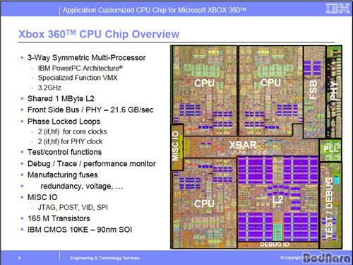 XBOX 360¿¡ µé¾î°£ IBM ÇÁ·Î¼¼¼­ÀÇ ¸ð½ÀÀº ¶È°°Àº Å©±âÀÇ 3.2GHz ÄÚ¾î 3°³¿Í À̵éÀÌ °øÀ¯ÇÏ´Â 1MB L2 ij½Ã·Î ±¸¼ºµÇ¾î ÀÖ´Ù. 90nm SOI °øÁ¤À¸·Î Á¦Á¶µÇ¸ç 1¾ï 6õ 5¹é¸¸°³ÀÇ Æ®·£Áö½ºÅͰ¡ µé¾î°£´Ù.